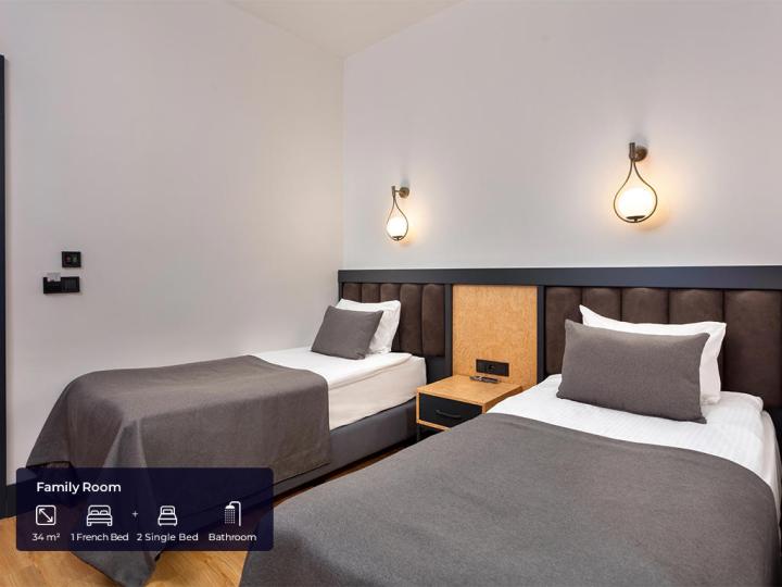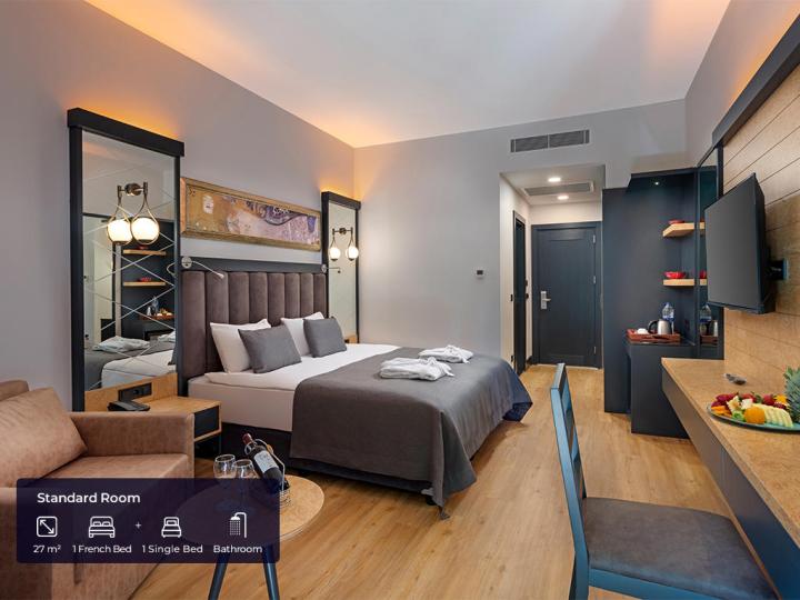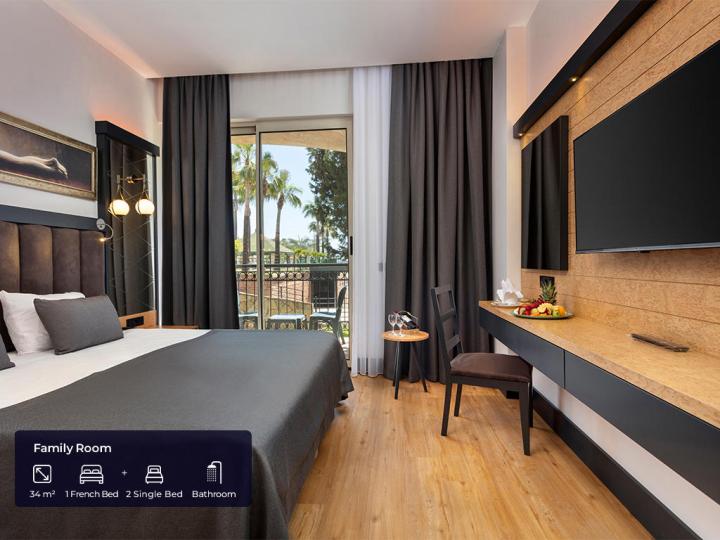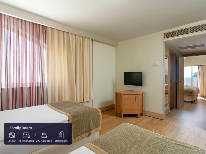 Hotel ukupno ima 308 soba u 6 blokova. Standardne sobe su moderno opremljene, površine 27 m2 i imaju: kupatilo sa kadom ili tuš kabinom, fen za kosu, klima uređaj, telefon, mini bar (puni se svakog dana sokovima, pivom i vodom), sef, LCD SAT TV, balkon ili terasu. U sobama na podu je tepih. Porodične sobe su površine 34m2 i ima ih ukupno 62, isto su opremljene kao standardne sobe a sastoje se iz dve sobe povezane vratima i jednog kupatila.